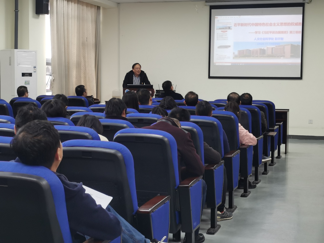 根据公司党委组织部、宣传部部署和工作要求,结合理论学习工作安排,11月19日下午,公司党委在在农科大楼3073会议室举行《习近平谈治国理政》第三卷学习报告会暨公司党委理论学习中心组(扩大)学习会。会议由公司党委书记冯发明主持,人文社会科学处副处长彭开智作专题报告,学院全体教工参加会议。