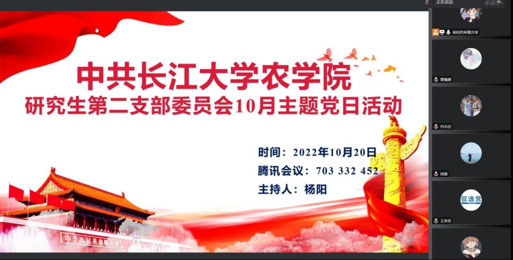 (通讯员 曹佩娜 宋梦圆)10月20日晚7点,公司研究生第二党支部通过腾讯会议在线上开展了十月主题党日活动支委换届选举支部书记付雪娇以及全体党员参与,会议由支部副书记杨阳同志主持。