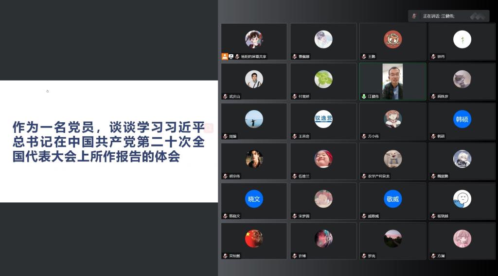 随后,全体党员以“作为一名党员,谈谈学习习近平总书记在中国共产党第二十次全国代表大会上所作的报告的体会”为主题展开研讨。大家表示,作为一名农科员工,要将自己专业所学,服务到生产实践当中;同时要勇于创新、专心科研,将自己的科研成果量化、质化,将自己的论文写在祖国的大地上,在国家的粮食安全和技术安全等方面做出贡献。