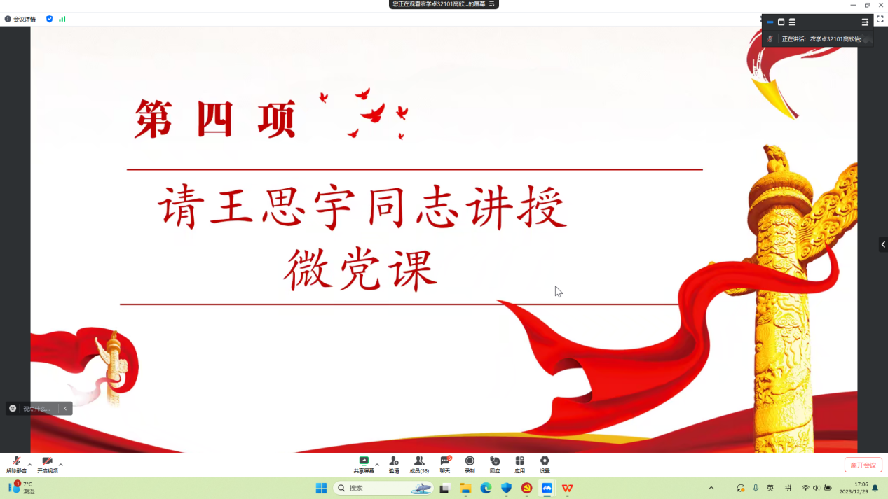 (通讯员 徐志鹏)12月29日晚上17:00,公司本科生党支部在腾讯会议开展十二月主题党日活动,支部党员应到44人,实到44人,本次活动由支部党员姜月兴同志主持。